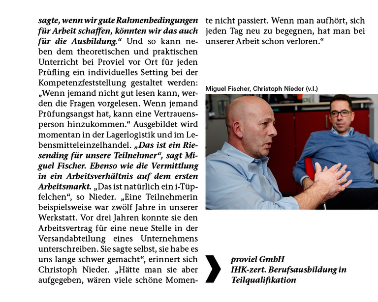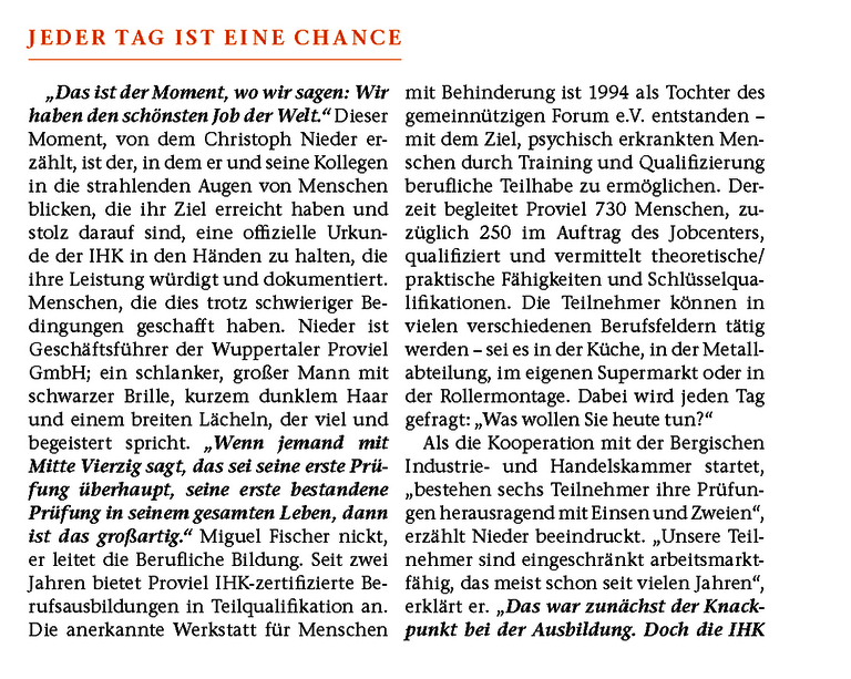 „Das ist der Moment, wo wir sagen: Wir haben den schönsten Job der Welt.“ Dieser Moment, von dem Christoph Nieder erzählt, ist der, in dem er und seine Kollegen in die strahlenden Augen von Menschen blicken, die ihr Ziel erreicht haben und stolz darauf sind, eine offizielle Urkunde der IHK in den Händen zu halten, die ihre Leistung würdigt und dokumentiert. Menschen, die dies trotz schwieriger Bedingungen geschafft haben. Nieder ist Geschäftsführer der Wuppertaler Proviel GmbH; ein schlanker, großer Mann mit schwarzer Brille, kurzem dunklem Haar und einem breiten Lächeln, der viel und begeistert spricht. „Wenn jemand mit Mitte Vierzig sagt, das sei seine erste Prüfung überhaupt, seine erste bestandene Prüfung in seinem gesamten Leben, dann ist das großartig.“ Miguel Fischer nickt, er leitet die Berufliche Bildung. Seit zwei Jahren bietet Proviel IHK-zertifizierte Berufsausbildungen in Teilqualifikation an.