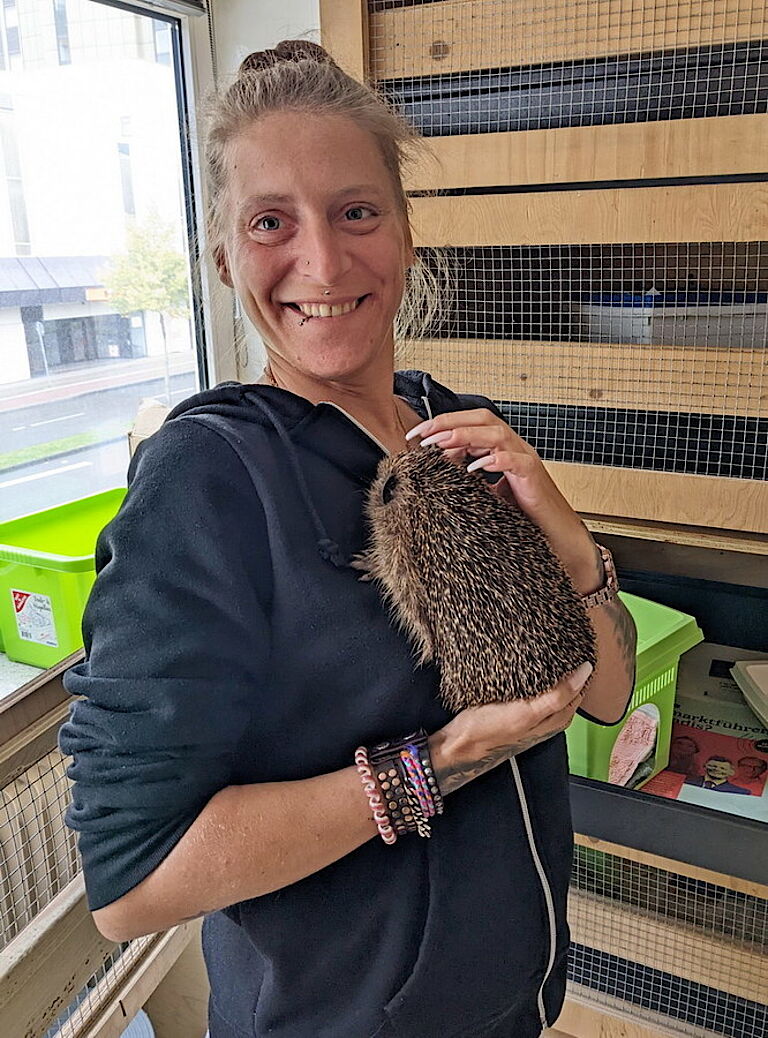 Zärtlich streicht Nina Becker über die kleinen Stacheln, die noch ganz weich sind. Neugierig guckt sie der junge Igel an. Ganz ruhig ist er auf ihrer Hand geworden, obwohl er kurz vorher noch auf der Suche nach Entdeckungen munter durch sein Gehege gelaufen ist. Seit einem halben Jahr arbeitet die provielerin mittlerweile mit viel Freude und Engagement in der Auffangstation des Netzwerks Igel e.V..