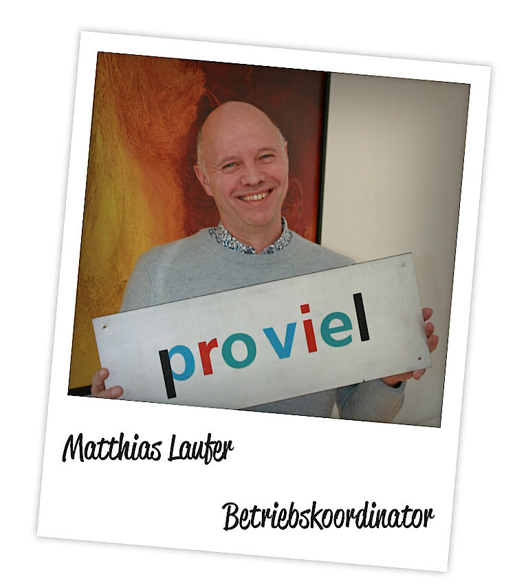 Damals befand sich auch noch die ehemalige Kleinkunstbühne vom Forum auf dem heutigen proviel-Gelände an der Milchstraße. Wenig später nahmen dort die ersten Zuverdiener ihre Arbeit auf. Nach einigen Jahren als Fachkraft für Arbeits- und Berufsförderung in der Werkstatt wurde Matthias Laufer dann angeboten, in der Geschäftsführung mitzuarbeiten. „Ich bin da irgendwie reingerutscht“, sagt er. Heute kümmert er sich um alles, für das niemand anderes explizit zuständig ist: Er setzt sich mit der Trinkwasserverordnung und dem Datenschutz auseinander, organisiert Energie-Audits und das Umsetzen der Corona-Schutzverordnung. Die EDV – in seiner Zeit von zwei Computern auf 150 Rechner und 230 Tablets gewachsen – hat er mittlerweile so gut aufgestellt, dass auch Angriffe mit Verschlüsselungsviren keinen großen Schaden anrichten konnten. Den größten Teil seiner Zeit widmet sich Matthias Laufer jedoch einlaufenden Anfragen und Aufträgen, Arbeitssicherheit und Qualitätssicherung. Nicht alle dieser Themen machen ihm immer Spaß. „Aber ich habe oft erlebt, wie die Arbeit hier die Menschen stabilisiert – das motiviert mich auch für unangenehme Arbeiten.“ Obwohl er heute die provieler nur noch bei seinen Wegen durchs Haus trifft: Die Begegnung mit den Menschen findet er spannend und immer wieder schön. Das erste Firmenschild von proviel, noch mit leicht anderem Logo, hat er damals hergestellt und bis heute im Büro liegen. „proviel hat wirklich eine bemerkenswerte Entwicklung durchgemacht!“