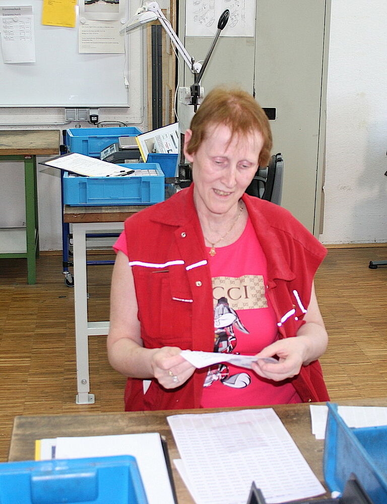 Früher einmal hatte Annette Eisenmacher auch „draußen“ gearbeitet, in einer Garnfabrik. Doch mit ihrer Krankheit wurde das schwierig. Seit 2004 gehört Annette Eisenmacher jetzt zu proviel und fühlt sich dort sehr wohl: „Das Schöne ist, dass man hier andere Leute trifft und sich anfreunden kann“, sagt sie. Und sie findet es gut, dass sie sich langsam an neue Dinge herantasten und meistens in einer ruhigen Ecke arbeiten kann. Geholfen hat ihr auch die Unterstützung durch die Fachkräfte: „Jetzt sag ich nicht mehr: ,Das kann ich nicht‘ - das hat mir Britta Düllmann beigebracht“, betont sie. Stattdessen probiert sie es erst einmal und weiß: Wenn sie Hilfe benötigt, ist immer jemand von den Fachkräften für sie da. In den proviel-Kursen hat sie auch Lesen und Schreiben trainiert. Das nutzt sie jetzt gerne, um die Zeitung zu lesen und Kreuzworträtsel zu lösen. Oft sitzt das Ehepaar gemeinsam an der Zeitung und diskutiert die Neuigkeiten.