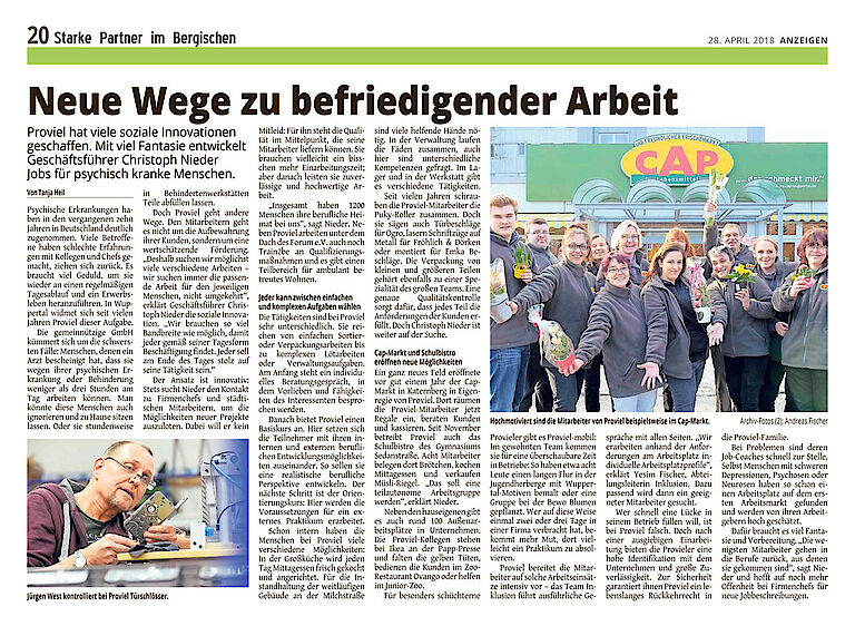 Dank der genannten Unternehmen und zahlreicher weiterer Aufträge stehen bei proviel vielfältige Möglichkeiten für personenzentriertes Training und Qualifizierung im "Echtbetrieb" zur Verfügung. Die Werkstatt ist Partner der Unternehmen - und auch die Unternehmen sind Partner der Werkstatt: Ende 20017 bewiesen sich täglich mehr als 100 Mitarbeiterinnen und Mitarbeiter von proviel und forum auf Arbeitsplätzen außerhalb der beiden proviel-Standorte - zum Beispiel bei Ikea, im "Okavango" im Grünen Zoo, im Schulbistro Sedanstraße, bei Scharco, D. La Porte, Vollmer Möbius oder beim Paritätischen NRW. Und 18 "provieler" konnten nach erfolgreicher Erprobung auf dem ersten Arbeitsmarkt im vergangenen Jahr einen neuen Arbeitsvertrag bei einem Unternehmen außerhalb der Werkstatt unterschreiben.