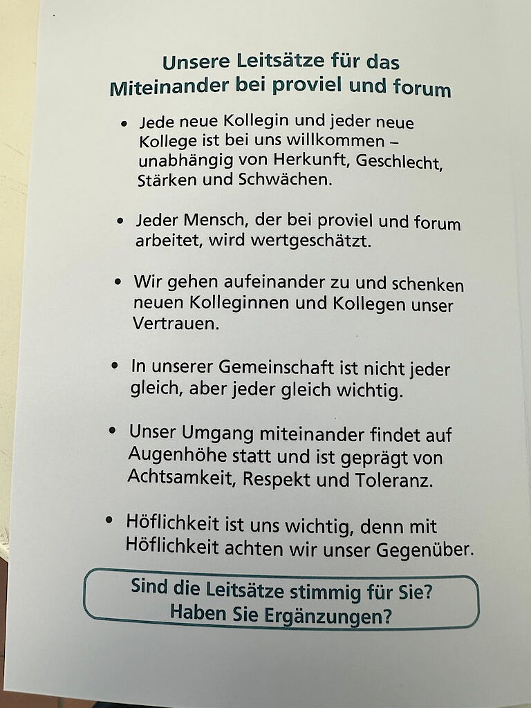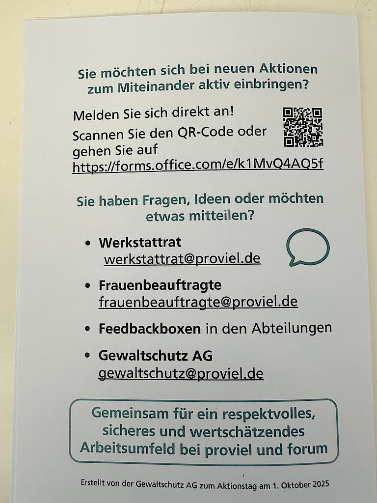 Unter dem Motto „Ein gutes Miteinander ist der beste Gewaltschutz!“ fand bei proviel und forum am 1. Oktober der Miteinander-Aktionstag 2025 statt – organisiert von der paritätisch besetzten Begleitgruppe Gewaltschutz, bestehend aus Mitarbeitenden und Fachpersonal. Mit viel Engagement wurde der Tag über Monate hinweg vorbereitet. Allen Mitwirkenden ein herzliches Dankeschön!