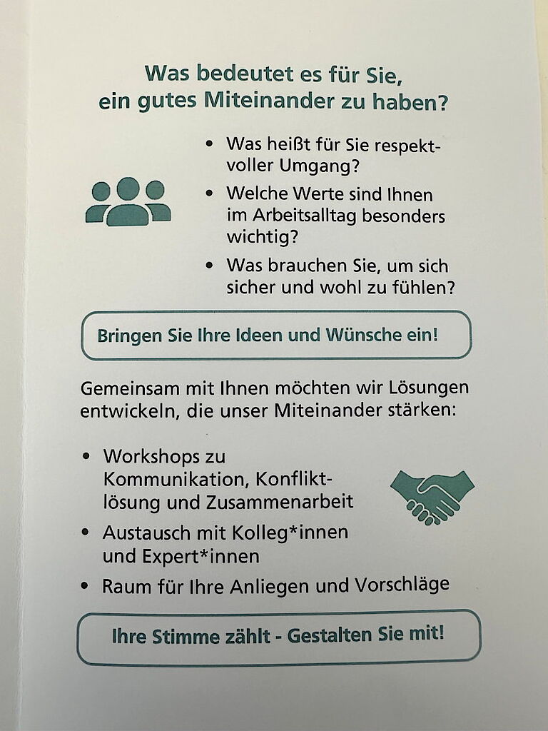 Der Aktionstag setzte ein starkes Zeichen für eine gewaltfreie, wertschätzende Betriebskultur und ein gutes Arbeitsklima. Er war als Auftakt gedacht – das Thema soll künftig in vertiefenden Workshops weiterbearbeitet werden, direkt an den Orten, an denen wir täglich zusammenarbeiten. Die Bereitschaft zur aktiven Mitgestaltung wurde am Aktionstag deutlich gefördert und bleibt weiterhin willkommen.