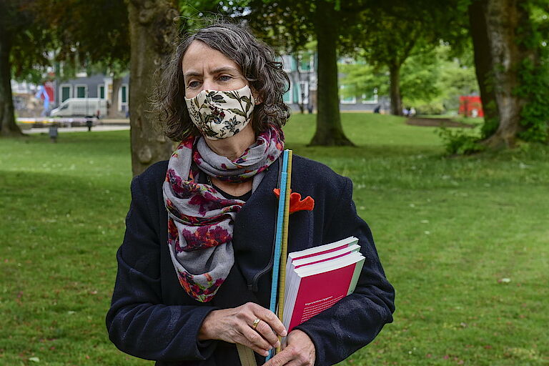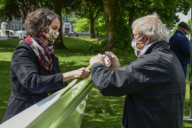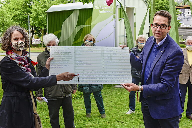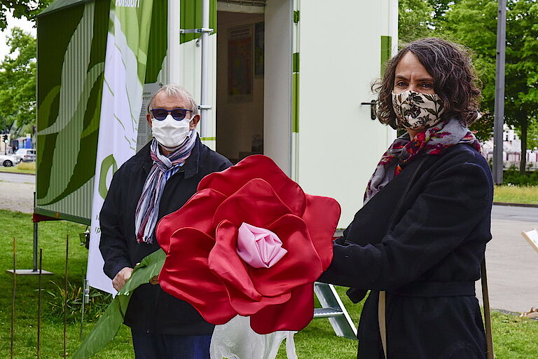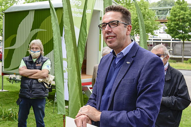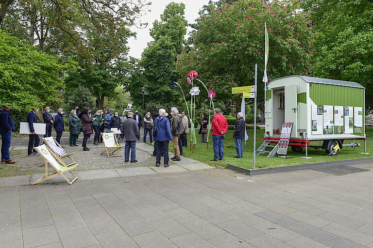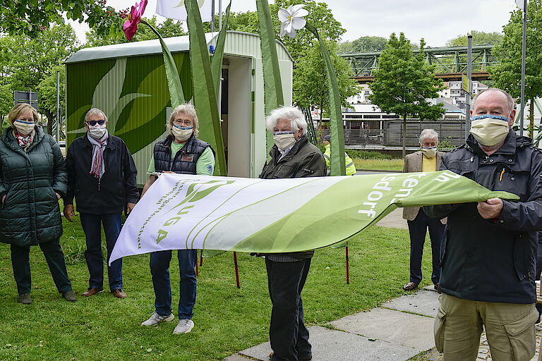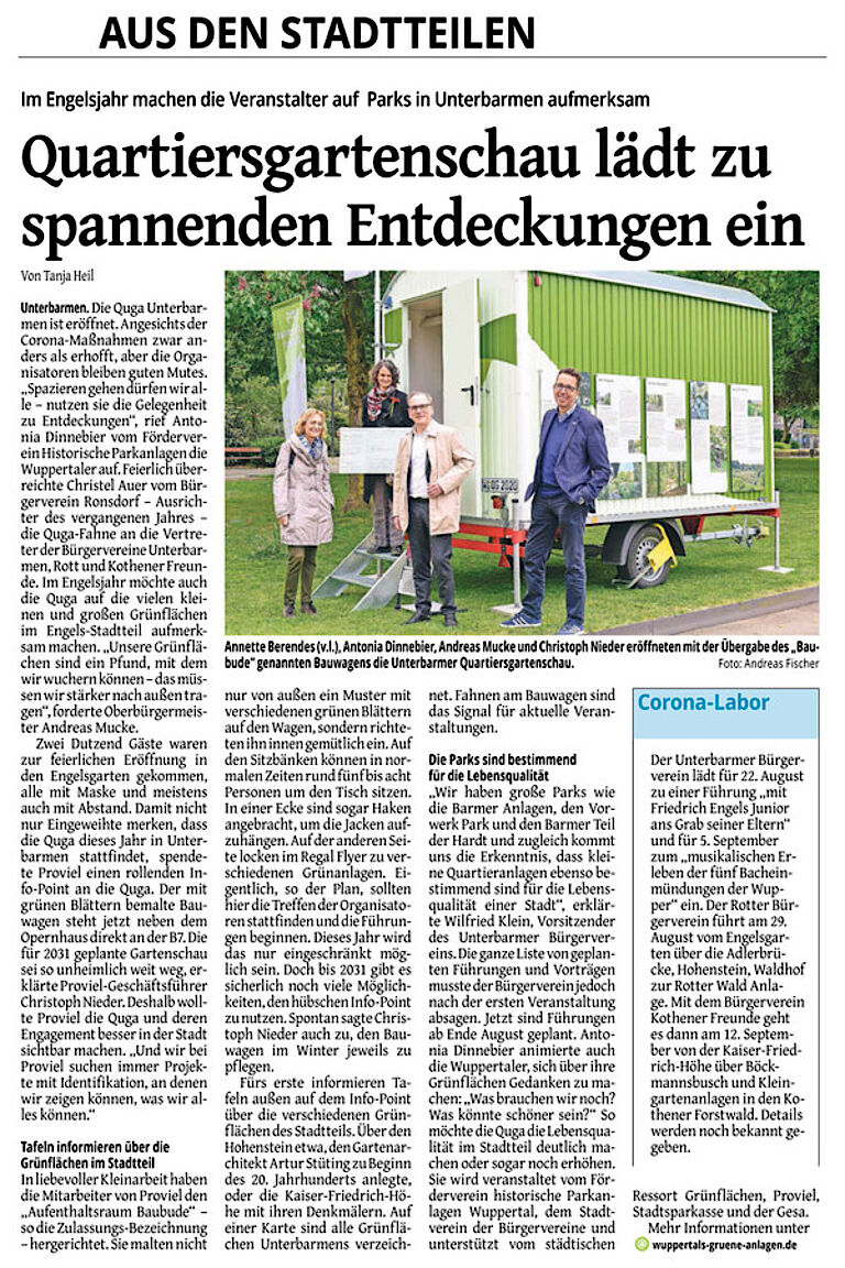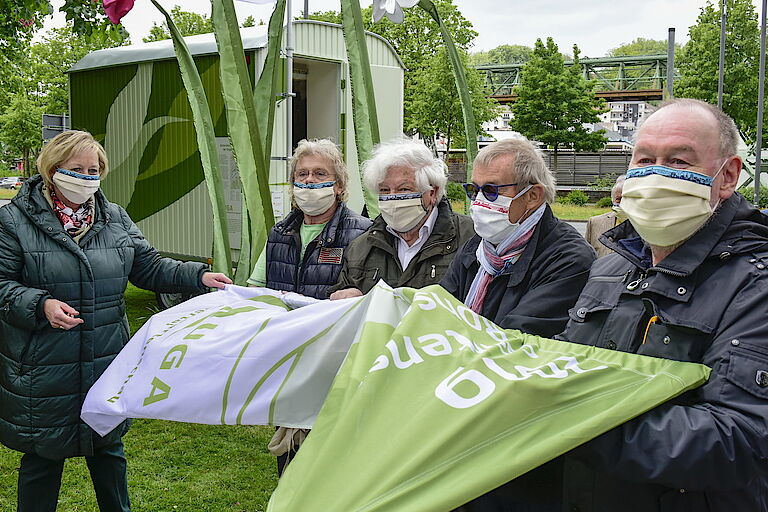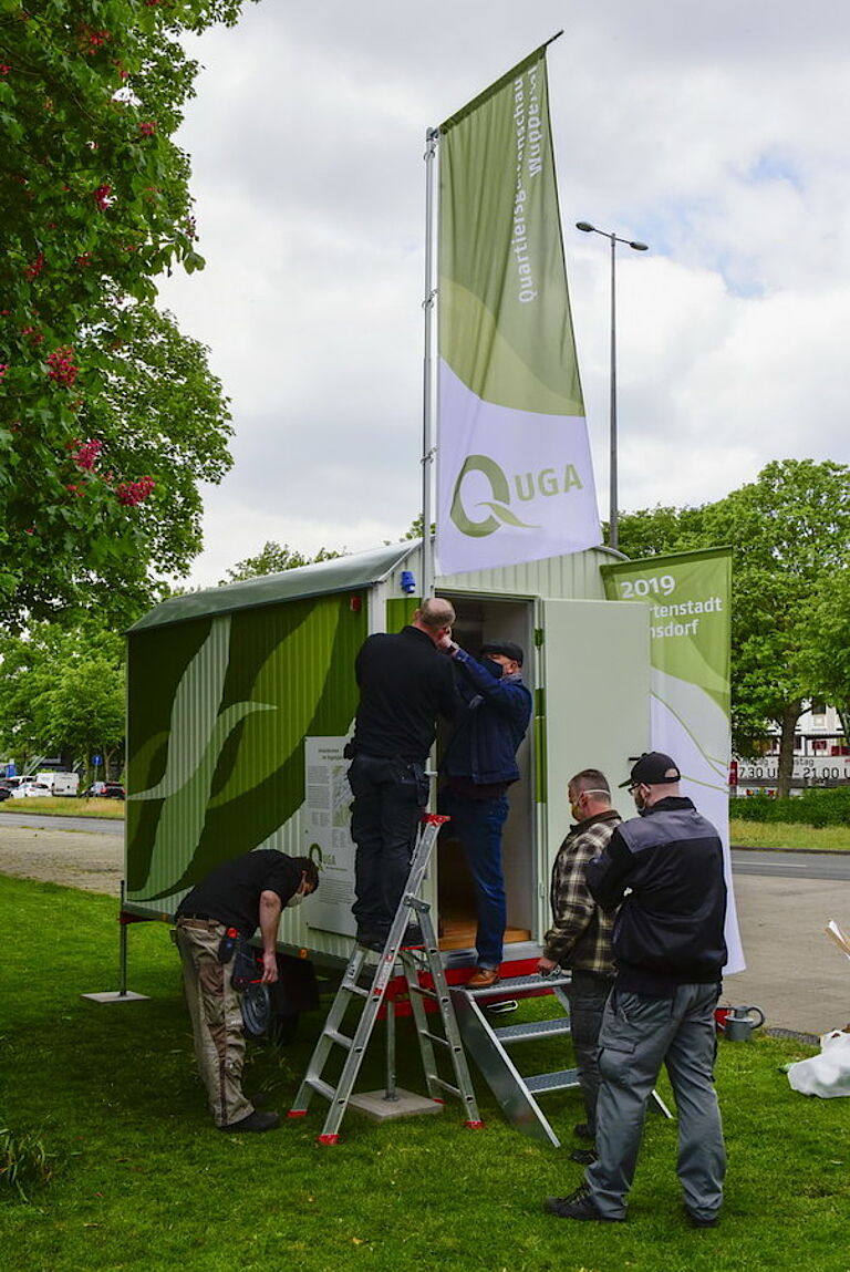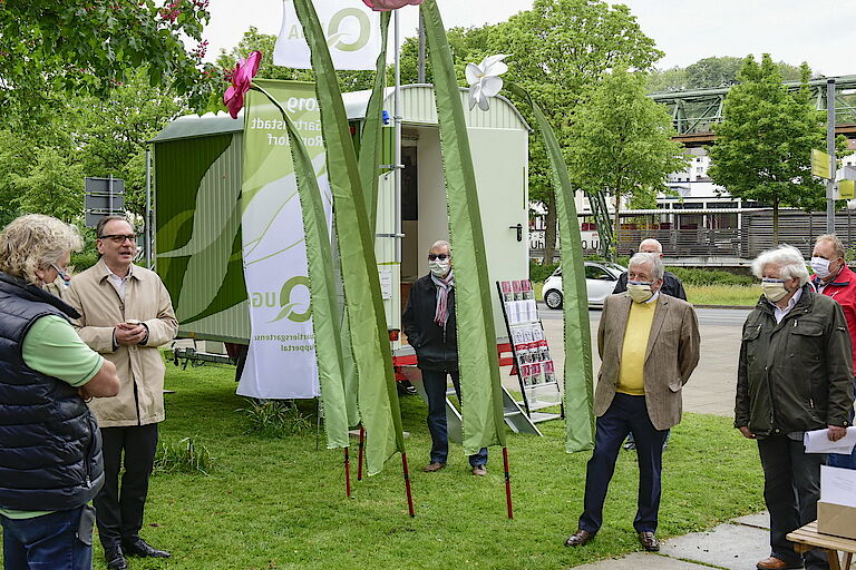 Dankbar nahm Antonia Dinnebier dieses Angebot an. Auch Oberbürgermeister Andreas Mucke freut sich über das Engagement für die Quga: „Unsere Grünflächen sind ein Pfund, mit dem wir wuchern können – das müssen wir stärker nach außen tragen.“ Der Info-Point, bei Veranstaltungen mit hohen Fahnen geschmückt, macht alle mit Auto und Schwebebahn Vorbeifahrenden darauf aufmerksam.