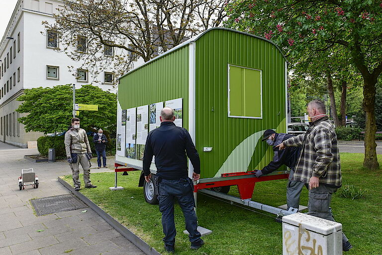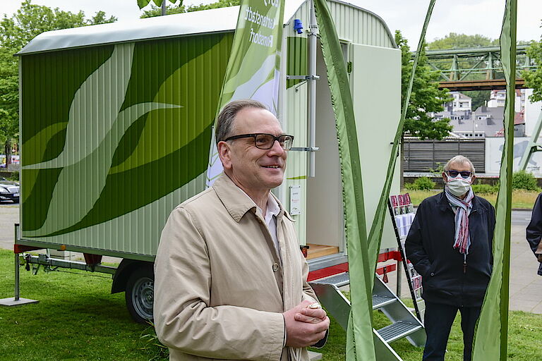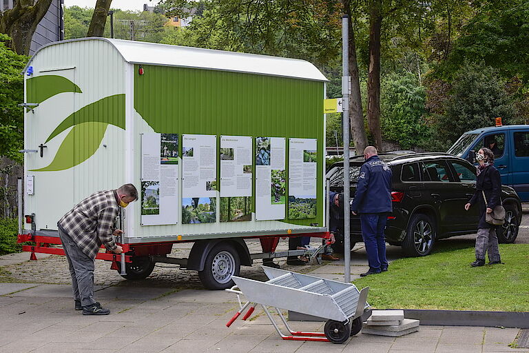 Draußen am Wagen locken Schilder mit Bildern und Texten in die schönsten Parks von Unterbarmen. Drinnen laden Bänke und Tische zum Verweilen im „Aufenthaltsraum Baubude“ ein – derzeit zwar wegen der Ansteckungsgefahr vielleicht weniger, aber der Info-Point soll ja langfristig genutzt werden. „Wir wollen bis 2031 an Ihrer Seite sein und pflegen den Wagen auch im Winter und stellen ihn unter“, verspricht Christoph Nieder, Geschäftsführer von proviel.