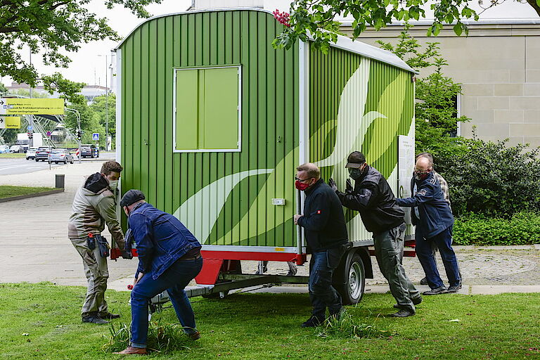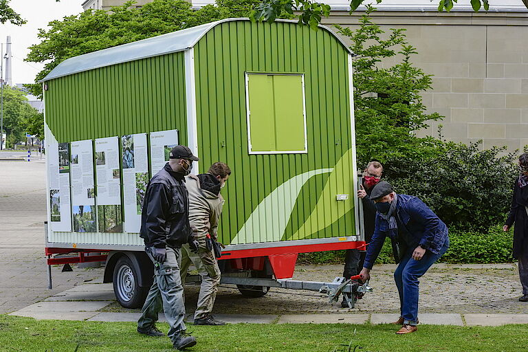Für jedes kleine oder größere Problem haben die kreativen provieler eine Lösung gefunden: Die große Fahne muss außen am Info-Point befestigt werden? Sie schraubten dafür eine Halterung einer Satellitenschüssel daran. Wo sollen die Jacken der Besucher ihren Platz finden? Dafür befestigten sie große Haken im Wagen. Material kann in den Bänken verräumt werden. Wenn bald wieder Führungen stattfinden dürfen, können sich die Beteiligten dann am Info-Point treffen. Bei Regen bietet dieser auch ein trockenes Plätzchen. Und jederzeit können Passanten sich informieren, in welcher Grünanlage sie schön spazieren gehen können.