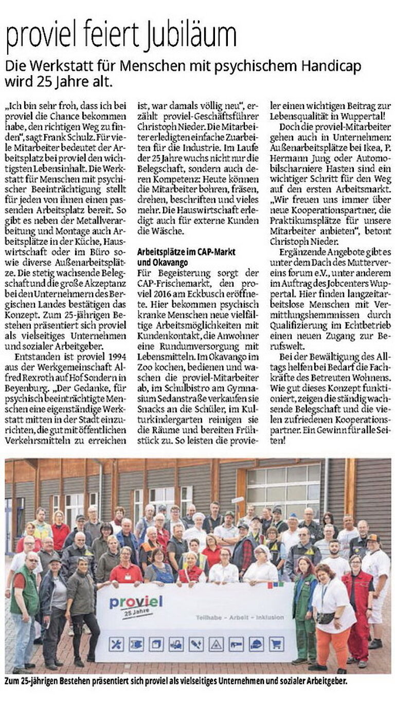 „Ich bin sehr froh, dass ich bei proviel die Chance bekommen habe, den richtigen Weg zu finden“, sagt Frank Schulz. Für viele Mitarbeiter bedeutet der Arbeitsplatz bei proviel den wichtigsten Lebensinhalt. Die Werkstatt für Menschen mit psychischer Beeinträchtigung stellt für jeden von ihnen einen passenden Arbeitsplatz bereit. So gibt es neben der Metallverarbeitung und Montage auch Arbeitsplätze in der Küche, Hauswirtschaft oder im Büro sowie diverse Außenarbeitsplätze. Die stetig wachsende Belegschaft und die große Akzeptanz bei den Unternehmern des Bergischen Landes bestätigen das Konzept. Zum 25-jährigen Bestehen präsentiert sich proviel als vielseitiges Unternehmen und sozialer Arbeitgeber