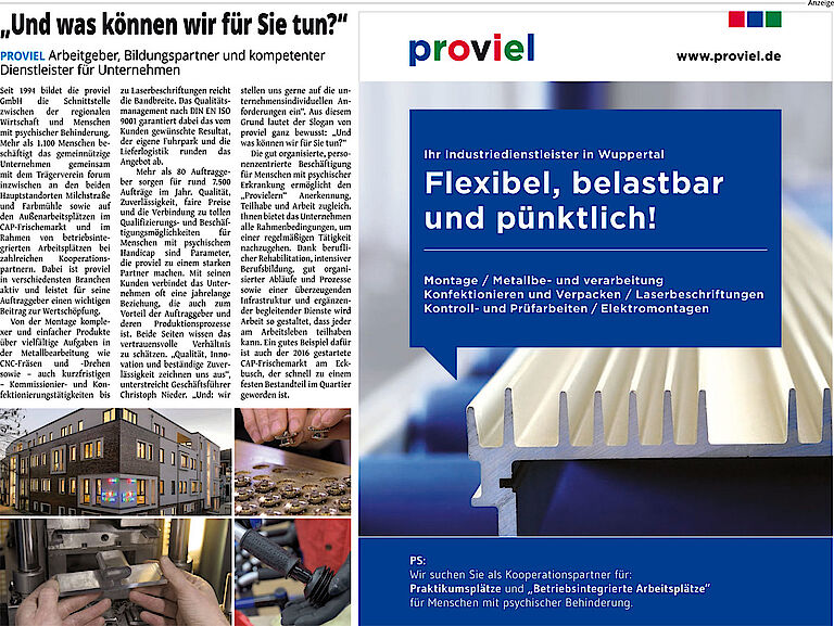 Mit dem neuen Pilotprojekt „proviel mobil“ startet proviel, die Werkstatt für Menschen mit psychischem Handicap, in diesen Tagen ein neues Dienstleistungsangebot für Unternehmen. Als bekannter Industriedienstleister für derzeit mehr als 80 Unternehmen in der Region wickelt proviel jährlich rund 7.500 Aufträge ab. Mit „proviel mobil“ geht jetzt ein zusätzliches Angebot an den Start, das den Mitarbeiterinnen und Mitarbeitern neue Möglichkeiten, Perspektiven und Wege der Inklusion eröffnet und für Unternehmen eine flexible, temporäre Lösung darstellt.