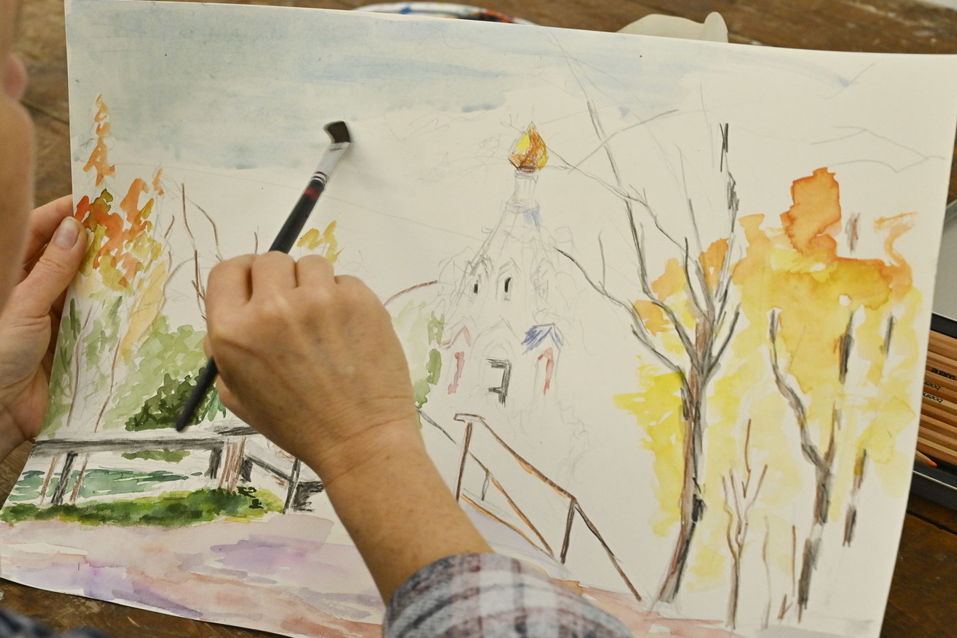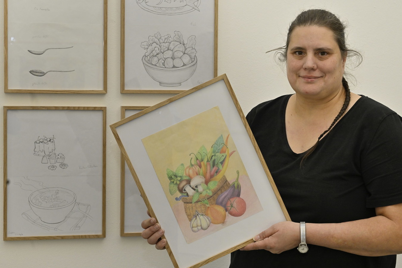 Anna malt mit Aquarellfarben surrealistisch anmutende Landschaften mit Wasser und Bäumen. „Für mich ist es wichtig, dass ich mich beim Malen beruhige“, sagt sie. „Vieles kann ich nicht mit Worten erklären – aber mit Bildern.“ Ganz anders hingegen die sehr detailgetreuen realistischen Küchenutensilien von Stephanie Wauer, die diese für ein Kochbuch malt.