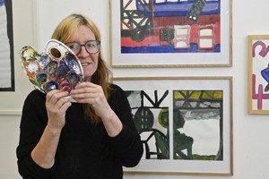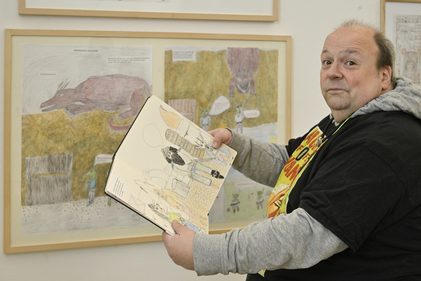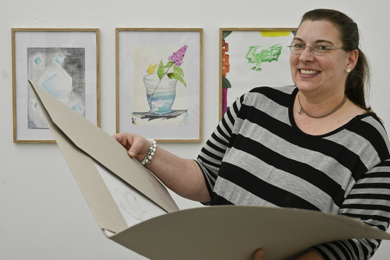 „Es ist Wahnsinn, was für Werke die Menschen von proviel hier in der Gruppe machen. Da steckt so viel Ausdruckskraft dahinter“, bewundert Jürgen Grölle seine Leute, denen er im Kurs immer wieder kleine Tipps gibt oder Tricks verrät. Vielen sei es schwer gefallen, fünf Werke für die Ausstellung auszusuchen. Jürgen Grölle entschied dann gemeinsam mit Künstlerin Jaana Caspary, wie die Bilder aufgehängt werden.